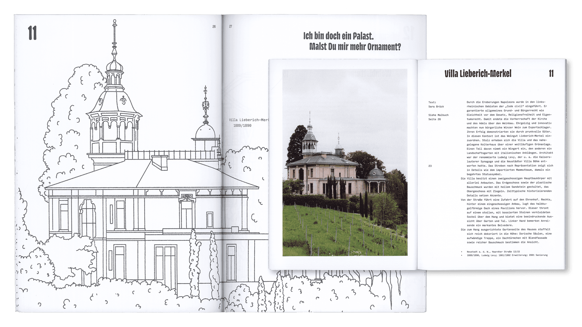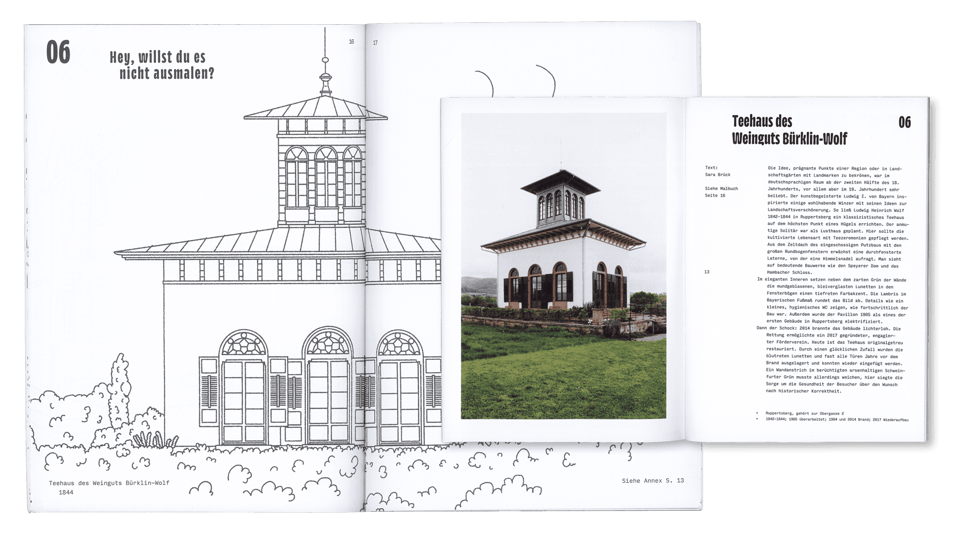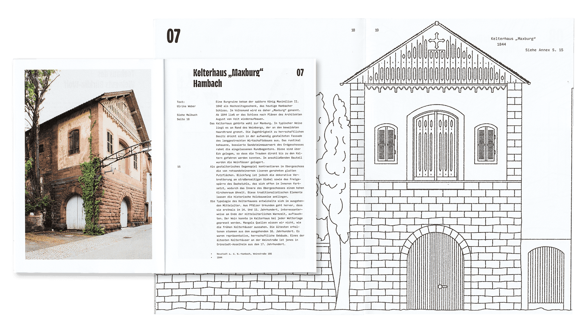 Durch das Mitmachbuch haben Kinder die Möglichkeit die Weinstraße auf ihre Art zu entdecken. Es werden spielerisch unterschiedliche architektonische Typologien vorgestellt, Dorfstrukturen und Baukonstruktionen aufgezeigt. Während die Kinder zeichnen, ausmalen und beiläufig mit den Besonderheiten der Architektur in Berührung kommen, können die Erwachsenen sich in einem kleinen Annex-Buch über die Gebäude informieren und ihr Wissen mit den Jüngsten teilen.
